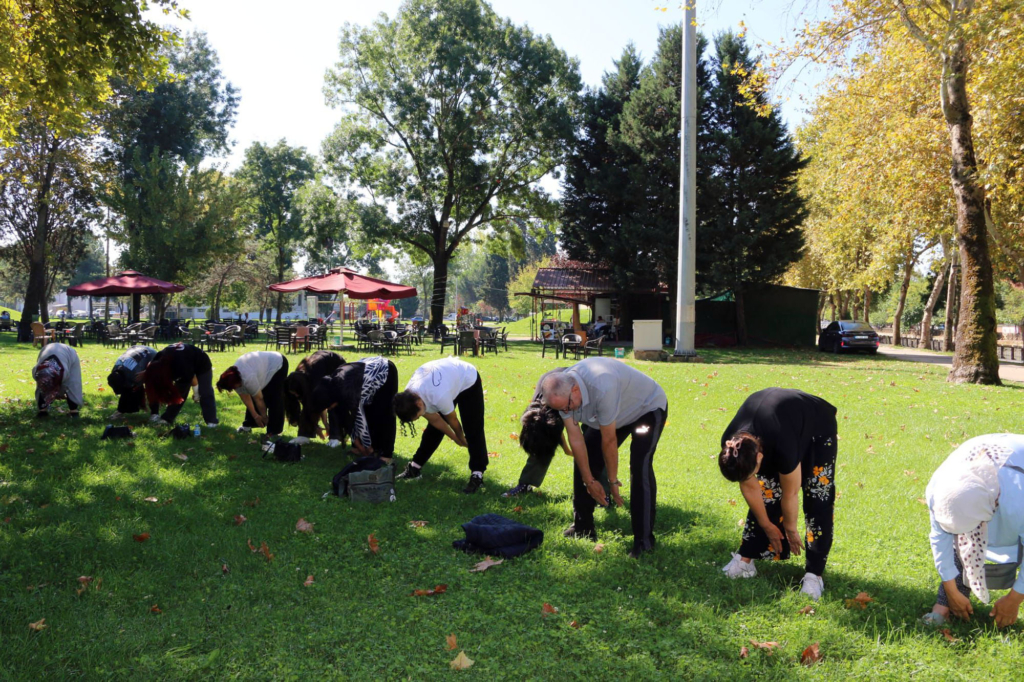 Park içerisinde yapılan ısınma hareketleri, yürüyüş ve çeşitli sportif faaliyetlerle hem